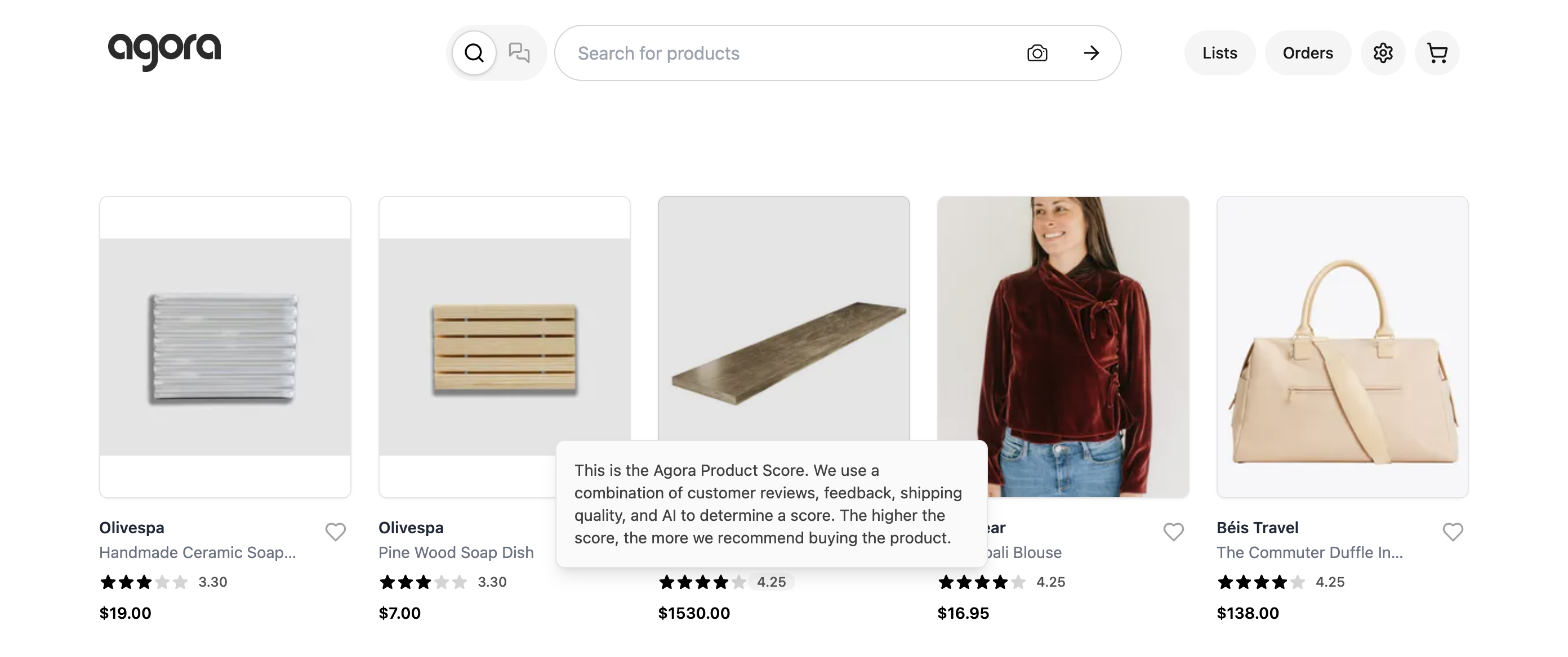 The Agora Product Score is a number between 0 and 100 that defines a product's quality on Agora and servers as guidance for customers on what items we believe are high quality. The number is the result of a set of criteria that are analyzed by artificial intelligence tools applied to our dataset. The final product score is represented on Agora in a scale out of 5.
